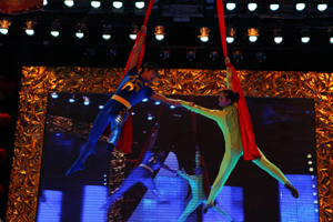 整場(chǎng)晚會(huì)以興業(yè)集團(tuán)成立10周年走過的光輝歲月為主線,在興發(fā)公司選送的歌伴舞《吉祥頌》中拉開了帷幕,伴隨著激越的鼓點(diǎn)、歡快的舞蹈、喜悅的歌聲,霎時(shí),千米演播大廳成為了歡樂的海洋。興業(yè)房產(chǎn)公司選送的歌舞《紅旗飄飄》、《愚公移山》,唱出了興業(yè)人對(duì)偉大祖國(guó)的熱愛和百折不撓的創(chuàng)業(yè)精神;興業(yè)汽配公司選送的《前門情思大碗茶》京味十足,集團(tuán)機(jī)關(guān)選送的原生態(tài)陜北民歌《山丹丹花開紅艷艷》和青春奔放的流行歌曲《改變自己》,展現(xiàn)了興業(yè)人多才多藝的時(shí)代風(fēng)采;天泰鋼構(gòu)公司田雯雯一曲《美麗心情》抒發(fā)了興業(yè)人對(duì)美好生活的熱愛和追求;房產(chǎn)公司姑娘們表演的富有濃郁民族特色的新疆舞《西域風(fēng)情》,勾起觀眾對(duì)邊疆風(fēng)情的片片遐想。集團(tuán)機(jī)關(guān)創(chuàng)作的配樂詩(shī)朗誦《興業(yè)十年頌》和音樂群口快板《說唱興業(yè)房產(chǎn)》,讓全場(chǎng)觀眾打開記憶之門,重溫了興業(yè)集團(tuán)10年的發(fā)展歷程,更是喚醒了興業(yè)人強(qiáng)烈的歷史使命感和自豪感,迸發(fā)出一股強(qiáng)大的自我升華的豪邁激情。青島永杰的姑娘們帶來的《激情水鼓》,奏響迎春盛典,震耳欲聾的鼓聲配合激昂的音樂,水花飛濺,光芒四射,引爆全場(chǎng)激情。友誼商店的姑娘們表演的運(yùn)動(dòng)時(shí)裝秀和社區(qū)老年人表演的太極功夫扇《夕陽(yáng)美》,活力十足的青春魅力與剛?cè)岵?jì)的白發(fā)矍鑠,演繹出了一幅興業(yè)大家庭的和諧美景。公司選送的小品《風(fēng)波》和興發(fā)公司選送的山東快書《大老郭趕春晚》,情趣交融,令人捧腹,反映出了當(dāng)代建筑工人的情感世界和興業(yè)人對(duì)企業(yè)的無限熱愛之情。雜技《夢(mèng)幻藍(lán)綢》驚險(xiǎn)刺激,動(dòng)人心魄,引起場(chǎng)下觀眾陣陣驚呼。當(dāng)全場(chǎng)觀眾期待已久的北京《OOB美少女組合驚艷亮相時(shí),場(chǎng)下掌聲雷動(dòng),歡呼一片,動(dòng)感十足的青春美少女用她們的成名作《地球媽媽》和一首《心想事成》,甜歌勁舞,征服了全場(chǎng)觀眾,再掀晚會(huì)新高潮。“山一樣的氣魄,海一樣的魂,春天里走來了興業(yè)人”,伴隨著晚會(huì)主題歌曲《興業(yè)春天》的響起,《興業(yè)春天》興業(yè)集團(tuán)2010年春節(jié)聯(lián)歡晚會(huì)華彩落幕。